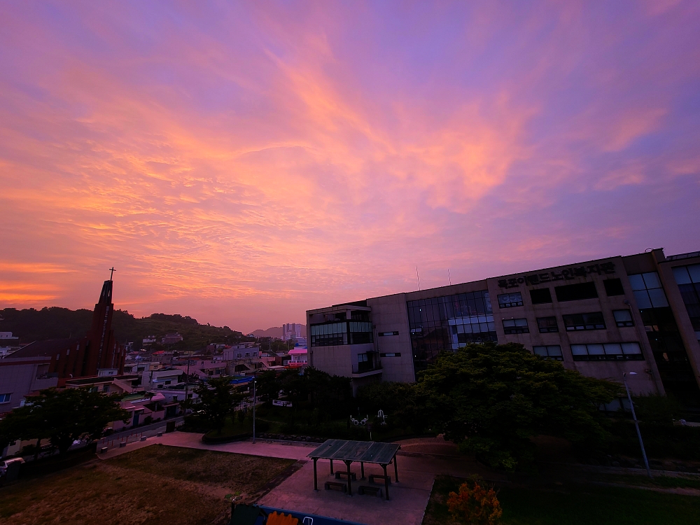해 질 녘? 아닙니다. 아침 해가 뜨기 직전 동녘 하늘입니다. 붉디붉은 빛이 하늘을 수놓고 있습니다. 처음에 불이 난 줄 알았는데 창문을 열어보니 일출 장면이었습니다. 일출이나 일몰 사진을 찍을 때는 마이너스 노출로 찍으십니다. 마이너스 노출이란 평상시 정상 노출보다 더 어둡게 찍는 것을 말합니다. 그럼 하늘 색도 더 진해지고, 사진이 어지럽지 않습니다.