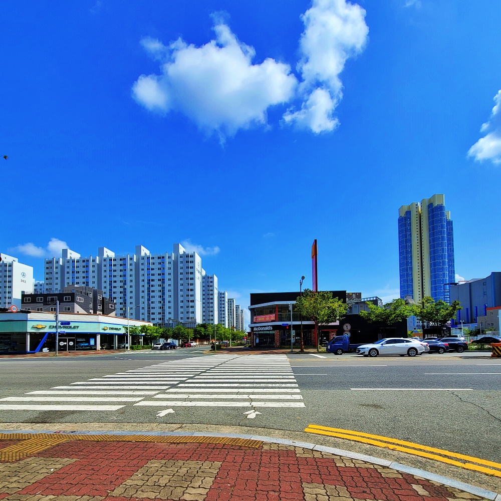 맑은 날 광각렌즈로 찍은 사진입니다. 비가 내린 후 찍은 사진이라 그런지 하늘색이 파랗습니다. 하늘과 아파트의 파란색이 묘하게 어울리네요. 직선적으로 찍었습니다.