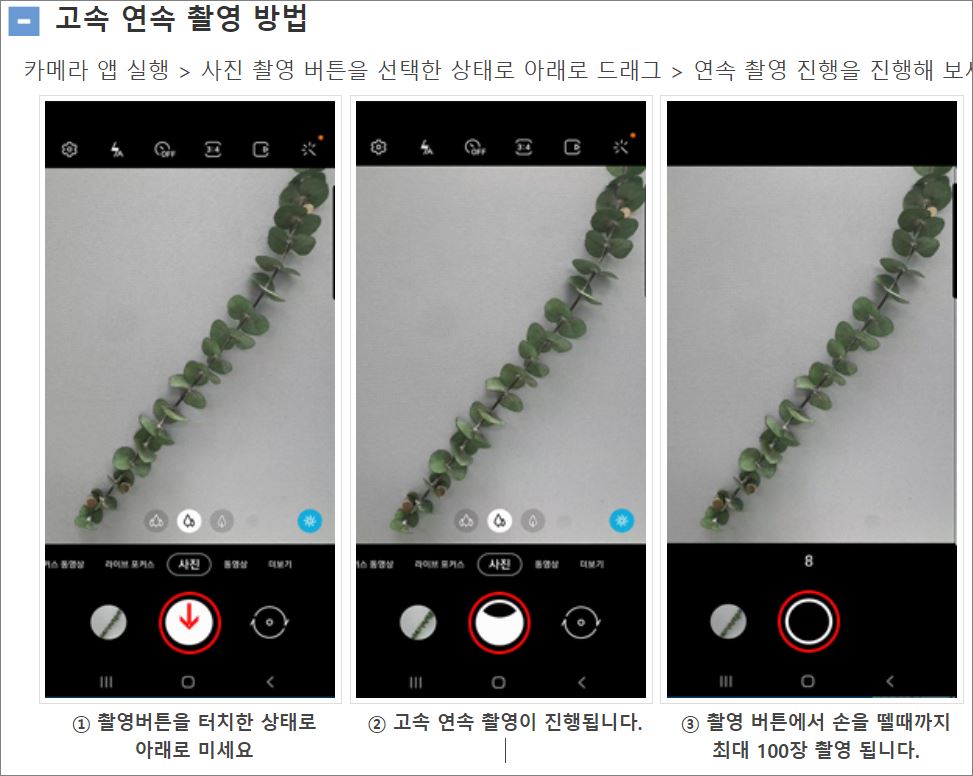 두 번째 방법은 앱의 촬영 버튼을 누른 상태에서 아래로 밀면 100장까지 연속 촬영이 됩니다.