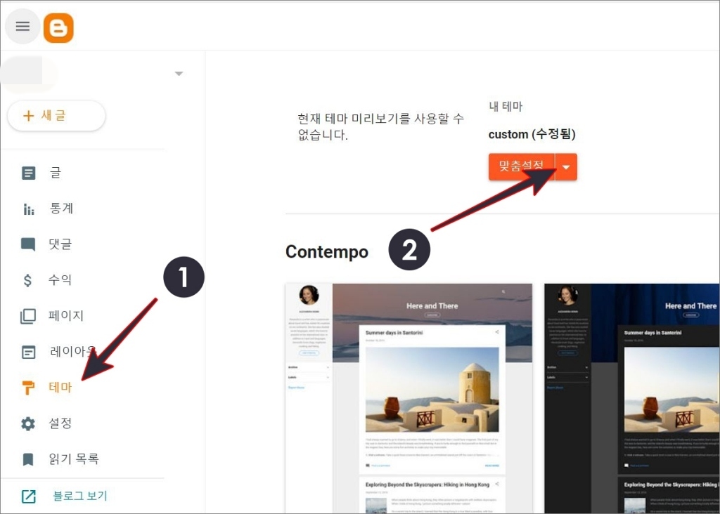 2. 테마의 내테마에서 맞춤설정 오른쪽 아래화살표 클릭