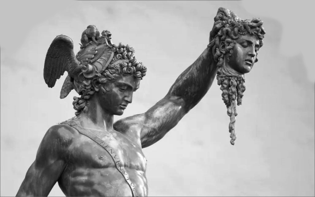 자신의 미로를 지나치게 뽐내다 여신들의 미움을 받고 머리카락 한 올이 뱀이 되어버린 메두사(Μέδουσα)가 있다. 그녀의 얼굴을 본 모든 사람은 돌이 되었다. 페르세우스는 아테나의 도움을 받아 메두사를 처치한다. 메두사의 머리는 아테나의 방패 앞에 박히게 된다. 방패와 메두사의 머리는 아테나의 방어적 전쟁의 의미를 부여한다.