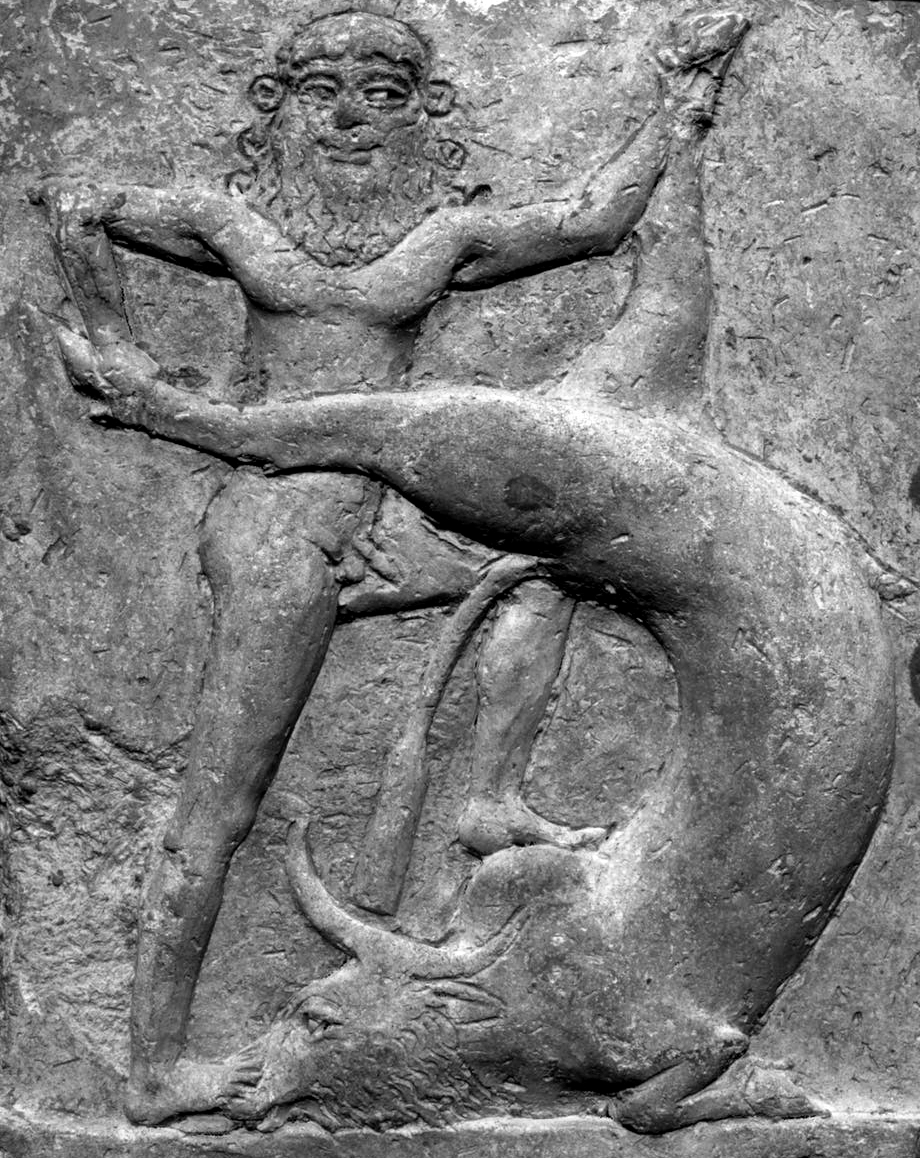 *아누는 이쉬타르를 위해 황소를 만들었고, 하늘 황소가 두 차례 콧바람으로 수많은 사람을 죽인다. 세 번째 콧바람을 내며 엔키두에게 달려간다. 엔키두는 겨우 피한다. 엔키두는 하늘로 뛰어올라 하늘 황소의 뿔을 잡는다. 하늘 황소는 엔키두의 얼굴에 침을 뱉는다. 두꺼운 꼬리로 그를 밀쳐낸다. 이때 길가메시가 황소에게 가서 죽인다.