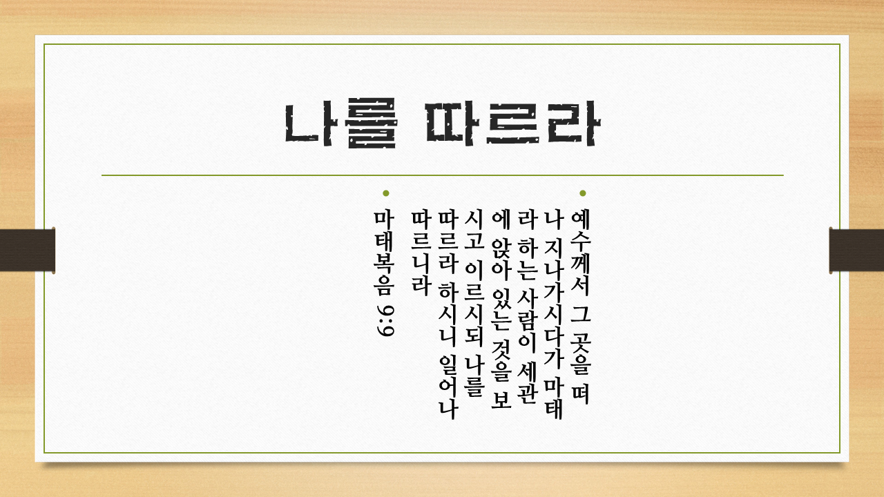 주님은 마태를 보시고 ‘나를 따르라’라고 말씀하십니다. ‘따르라’라는 헬라어 단어를 는 ‘아코뤼세오(ἀκολουθέω)’인데 ‘따라가다’ ‘결합하다’ ‘제자가 되다’는 뜻을 가지고 있습니다. 의역된 본문들에는 ‘함께 걷다’도 있습니다. 우리가 주님을 따른다는 말이 뭘까요? 그것은 주님을 본받는다는 말입니다.