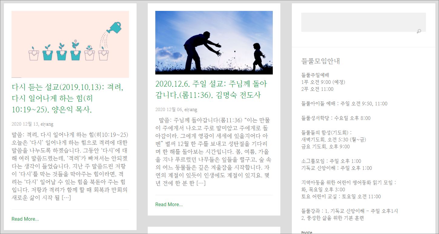 들풀(野草)은 아직 그 가치를 발견하지 못한 식물이라고 합니다(R.W Emerson). 지금은 교회가 잡초처럼 하찮게 여겨지는 시대이지만 교회의 가치와 소중함을 발견할 날을 꿈꾸며 열정을 가지고 원흥지역의 들풀로 소임을 다할 것입니다.