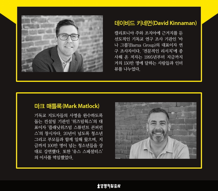 저자인 데이비드 키드먼은 우리나라 독자들에게도 낯설지 않다. 그는 기독교 연주조사기관인 바라그룹의 대표이자 연주 조사자이며, <나쁜 그리스도인> <청년들은 왜 교회를 떠나는가> <처치리스> <좋은 신앙> 등의 책들이 번역되어 많은 독자들의 공감을 얻어냈다. 공저자인 마크 매틀록은 20년이 넘도록 청소년 사역자들과 학생 그리고 부모들을 지도해 왔다. 한국에 번역되지는 않았지만 <Smart Faith>, <Real World Parents>, <Raising Wise Children> 등의 20권이 넘는 책들을 출간한 실력자이다. 그렇다면 이들의 관점으로 볼 때 현시대는 어떤 시대일까?