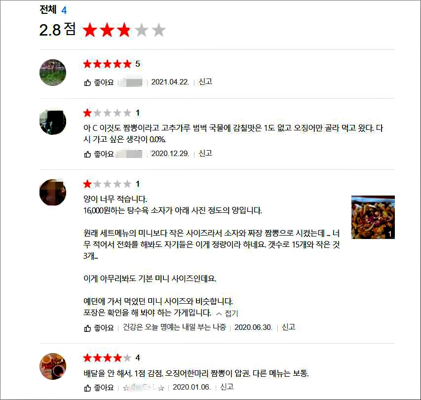 리뷰에 대한 생각. 다른 점에 비해 유난히 평점이 낮다. 2.8점이며 정말 낮은 편이다. 쭉 읽어보니 일단 짬뽕이 고춧가루만 있다는 말과 적은 양이다. 이 집은 직접 맛보지 않은 집이라 뭐라 말하기는 그렇지만 하여튼... 맛이 좋다기보다는 통오징어가 특색인 듯.