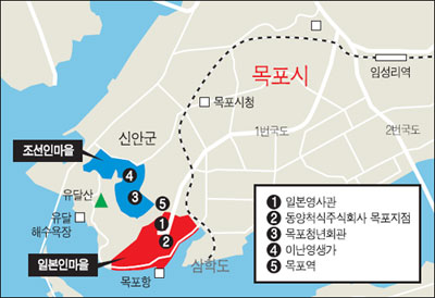 목포역역 남서쪽으로 바라보면 작은 동산에 허름한 집들이 옹기종기 모여있다. 삼학도가 한 눈에 내려다 보이는 이곳의 원래 이름은 송도(松島)였다. 소나무가 많다하여 송도라 불렀다. 일제강점기 시절 일제는 이곳의 소나무를 모두 베어내고 벚꽃을 심고 동산 중앙에 신사를 만들었다. 아직도 신사터가 가정집 안에 자리하고 있고, 신사로 올라가는 77계단은 아직도 남아있다. 보수하여 다듬어지기는 했지만 형태는 그대로다. 목포사람들은 송도라는 섬 이름을 모르는 사람들이 거의 대부분이다. 이해가 잘 안 된다. 목포 사람치고 목포 역사를 아는 아는 사람의 희귀할 만큼 적다.