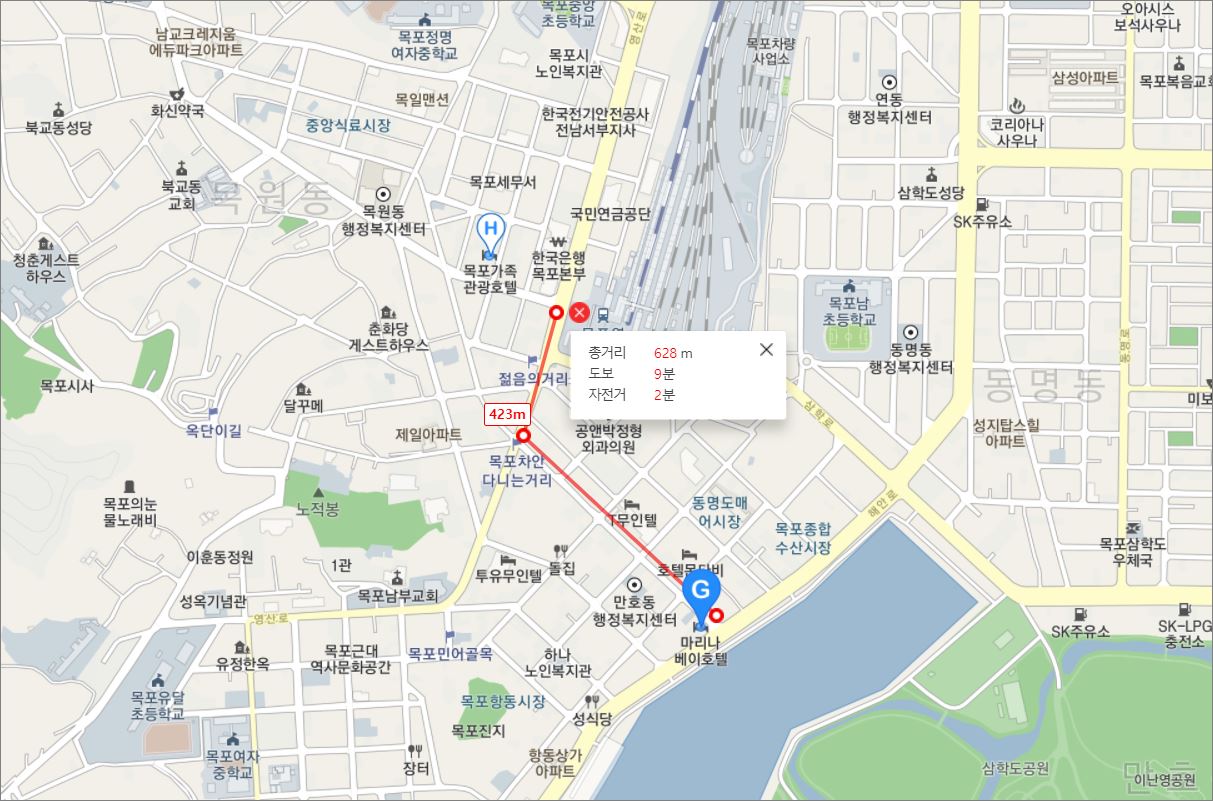 삼학도 건너편에 있는 '마리나 베이 호텔'이다. 목포역 근처에 있는 '가족호텔'은 다른 곳이다. 물론 이곳도 목포역에서 쉽게 걸어갈 수 있는 곳이다. 시장이 지근이고, 근대화 거리가 가까워 좋은 입지를 갖추고 있지만 의외로 평이 좋은 곳이다. 특히 가족 단위로 오는 분들이 이곳을 많이 애용한다고 한다.