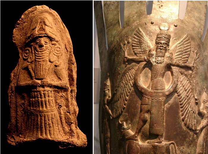 아후라 마즈다는 어디서 온 것일까? 페르시아 그 이전의 세계로 돌아가면 비슷한 한 신을 만나게 된다. 그의 이름은 아누(Anu)다. 아래의 오른쪽 그림을 보면 아누와 아후라 마즈다의 모습이 정확하게 일치하고 있는 것을 볼 수 있다.