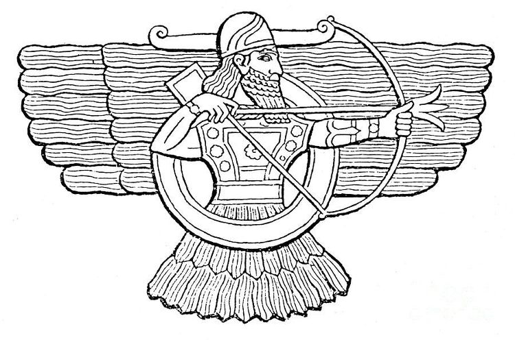 수메르의 안은 앗시리아 인들에 의해 아슈르(Ashur)로 변형되어 등장한다. 아슈르는 두 가지 형태로 발견된다. 하나는 화살을 쏘는 모습과 왼손에 고리를 들고 있는 모습이다. 중앙의 원은 태양이고, 태양에 날개가 달려 있다. 아슈르의 모습에도 권위의 원이 보인다.