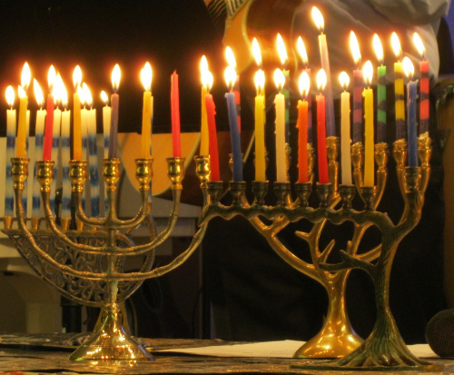 하누카에 사용되는 등불은 모양이 다르다. 성전 안의 촛대는 모두 7가지이지만, 하누카의 촛대는 모두 9개이다. 양쪽 4개씩과 중앙에 한 개가 있다. 중앙의 한개는 처음부터 켜고, 나머지는 하루에 한 개씩 붙여간다. 마지막 8일찌 되는 날은 모든 촛대에 불이 켜져 가장 환하다.