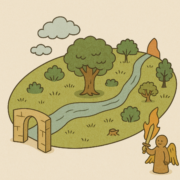 에덴 동산은 히브리어로 "에덴(עֵדֶן)"이라 하며, 하나님께서 동쪽에 특별히 조성하신 정원입니다(창세기 2:8). 창세기 2장과 3장을 종합하면, 에덴은 세 개의 구획으로 이해될 수 있습니다: 에덴 외곽 지역, 동산(가운데 정원), 그리고 동산 중앙의 생명나무가 있는 중심부입니다.