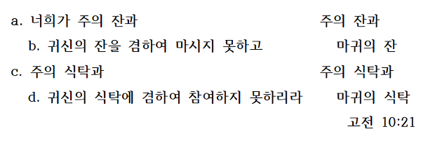 “바울은 성찬식에 관해 논하면서, 우상과 관련된 예식과 성찬식의 성례에 동시에 참여할 수 있다는 고린도 교인들의 착각에 대해 지적한다.”(베일리,83쪽)