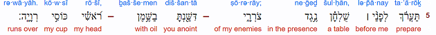 5 주께서 내 원수의 목전에서 내게 상을 차려 주시고 기름을 내 머리에 부으셨으니 내 잔이 넘치나이다