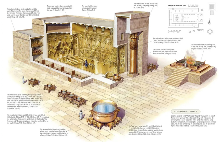 - 의미: 성전 바깥뜰에 설치된 큰 청동 물통으로, 제사장들이 정결 의식을 행하기 위해 사용되었습니다. 이는 정결과 깨끗함, 하나님의 거룩함을 상징합니다(열왕기상 7:23-26).