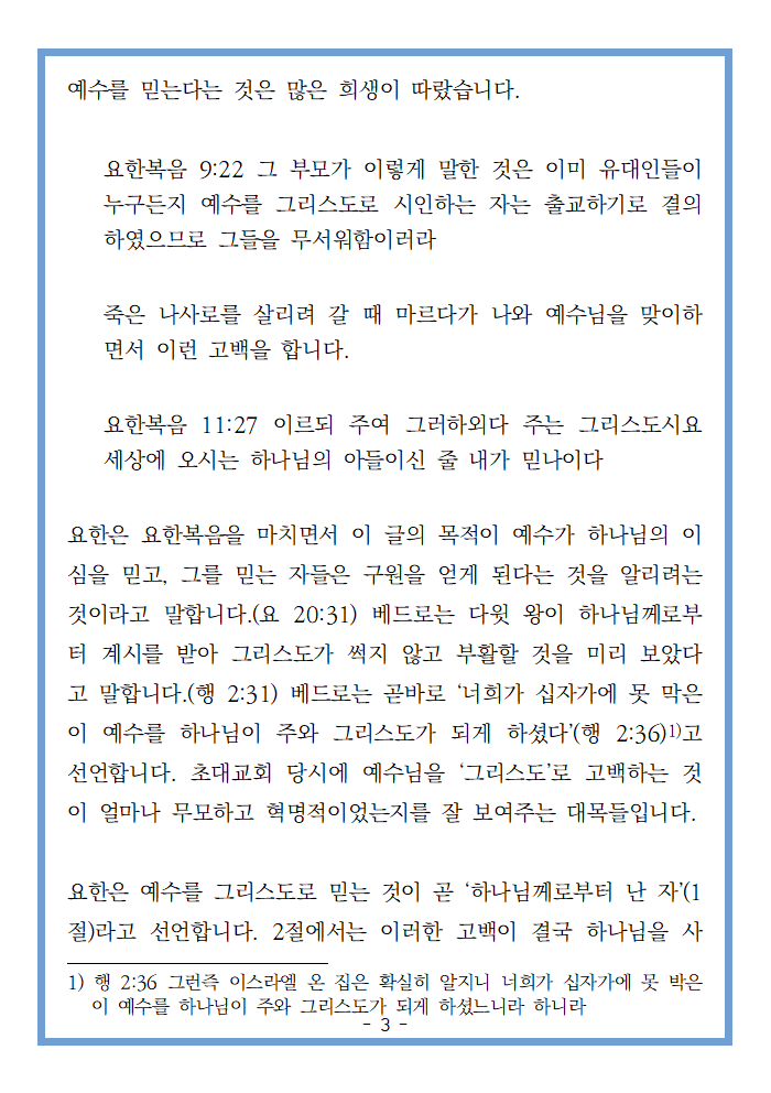 그럼 왜 예수의 그리스도 되심이 중요할까요? 당시 상황을 살펴볼 필요가 있습니다. 유대인들, 특히 종교지도자들은 예수를 그리스도로 고백하는 자들을 출교 시키기로 결의했습니다. 즉 사회적으로 예수를 믿는다는 것은 많은 희생이 따랐습니다.