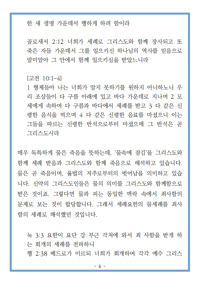매우 독특하게 물은 죽음을 뜻하는데, ‘물속에 잠김’을 그리스도와 함께 세례 받음과 그리스도와 함께 죽음으로 해석하고 있습니다. 물은 곧 죽음이며, 율법의 저주로부터의 벗어남을 의미하고 있습니다. 신약의 그리스도인들은 물의 의미를 그리스도와 함께함으로 받은 것이죠. 그렇다면 물과 피는 동일한 맥락 속에서 죄사함의 문제로 보는 것이 합당합니다. 그래서 세례요한의 물세례를 죄사함의 세례로 해석했던 것입니다.