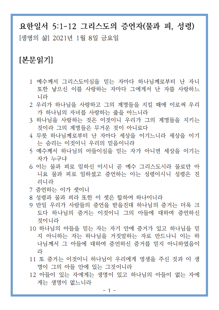 요한일서 5:1-12 그리스도의 증언자(물과 피, 성령)