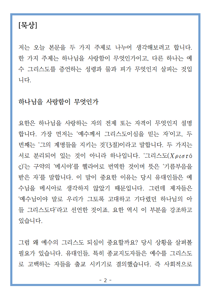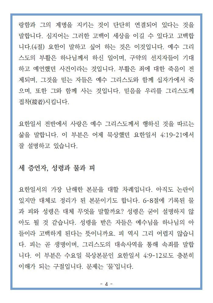 저는 오늘 본문을 두 가지 주제로 나누어 생각해보려고 합니다. 한 가지 주제는 하나님을 사랑함이 무엇인가이고, 다른 하나는 예수 그리스도를 증언하는 성령과 물과 피가 무엇인지 살피는 것입니다.