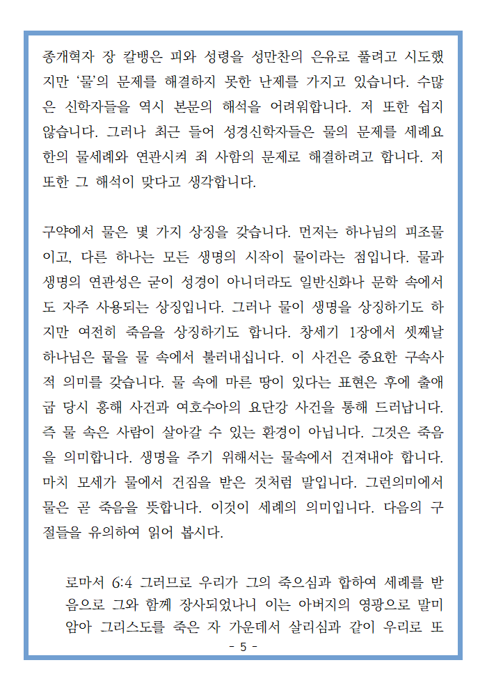 종개혁자 장 칼뱅은 피와 성령을 성만찬의 은유로 풀려고 시도했지만 ‘물’의 문제를 해결하지 못한 난제를 가지고 있습니다. 수많은 신학자들을 역시 본문의 해석을 어려워합니다. 저 또한 쉽지 않습니다. 그러나 최근 들어 성경신학자들은 물의 문제를 세례요한의 물세례와 연관시켜 죄 사함의 문제로 해결하려고 합니다. 저 또한 그 해석이 맞다고 생각합니다.