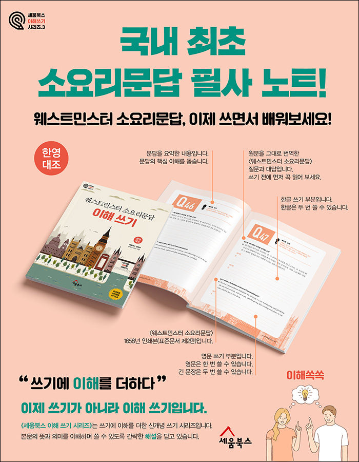 이번에 세움북스에서 ‘이해 쓰기’라는 시리즈는 쓰기 성경과 교리 쓰기를 출간하고 있습니다. 지난달에 <어린이 소요리문답 이해 쓰기>와 <로마서 이해 쓰기>를 출간한 바 있습니다. 이번 달에 세 번째 책으로 <웨스트민스터 소요리 문답 이해 쓰기>를 출간했습니다. 앞선 두 책은 김태희 목사가 해설을 달았고, 이번 책은 권율 목사가 수고했습니다. 권율 목사는 2018년 <원문을 그대로 번역한 웨스트민스터 소교리문답>집을 출간한 바 있는 웨스트민스터 소요리 문답에 대해 박식한 이해를 가지고 있습니다. 이번에 전공을 살려 해설을 추가함으로 완성도를 높였습니다. 해설은 극히 적고 축약된 형태입니다. ‘쓰기’에 집중하기 위해 최대한 간소화 시켰기 때문입니다.