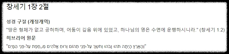 "땅은 형체가 없고 공허하며, 어둠이 깊음 위에 있었고, 하나님의 영은 수면에 운행하시니라." (창세기 1:2)