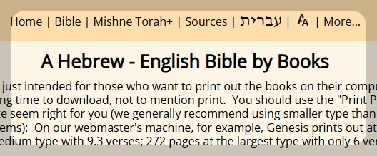 This copy of our Hebrew-English Bible is just intended for those who want to print out the books on their computers for study offline; note that some of these files are huge, and will take a long time to download, not to mention print. You should use the "Print Preview" function of your browser to see if the number of pages and letter size seem right for you (we generally recommend using smaller type than you would want when reading from the screen, unless you have vision problems): On our webmaster's machine, for example, Genesis prints out at 106 pages at the smallest type with 14 verses on the first page; 166 pages at medium type with 9.3 verses; 272 pages at the largest type with only 6 verses.