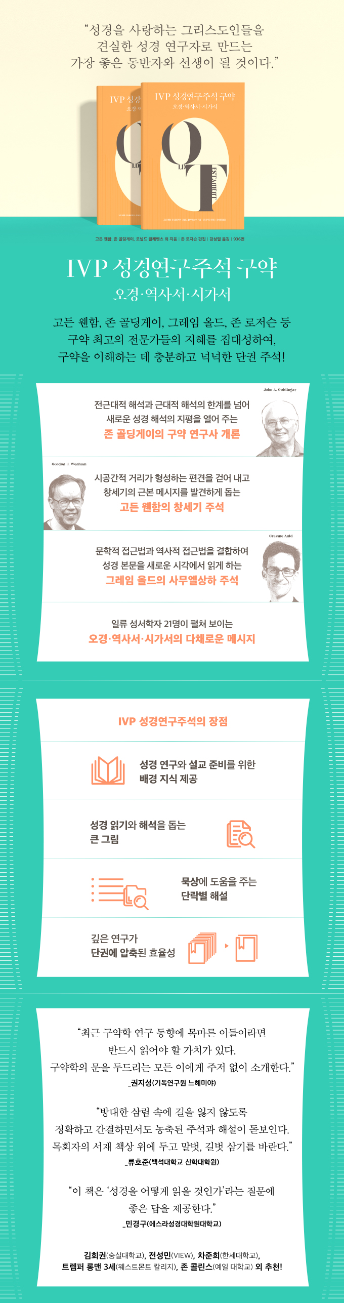 권지성(기독연구원 느헤미야), 김회권(숭실대학교), 류호준(백석대학교), 민경구(에스라성경대학원대학교), 전성민(VIEW), 차준희(한세대학교), 트렘퍼 롱맨 3세(웨스트몬트 칼리지), 존 콜린스(예일 대학교) 외 추천!